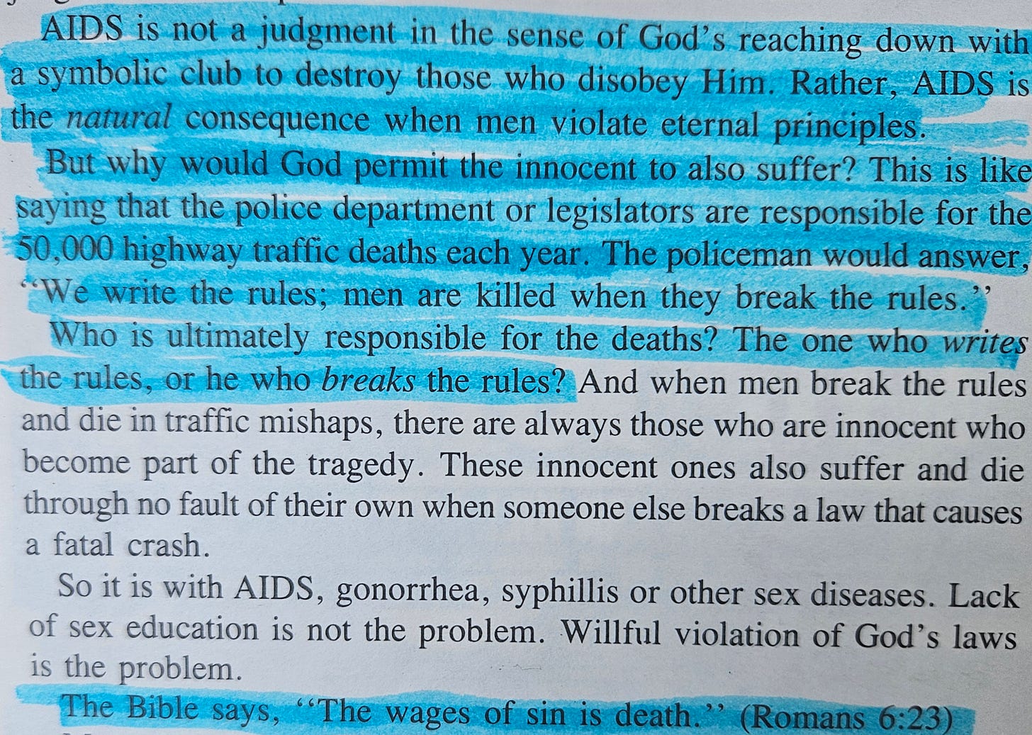 Why are the “56,000 cases of AIDS disease” (mentioned in Teen Turmoil) an act of God’s judgement, but 50,000 highway deaths aren’t? What makes you so sure that God isn’t demanding everyone cease driving immediately? This is just so dumb, and it’s so lame that this dude wrote a whole education curriculum.