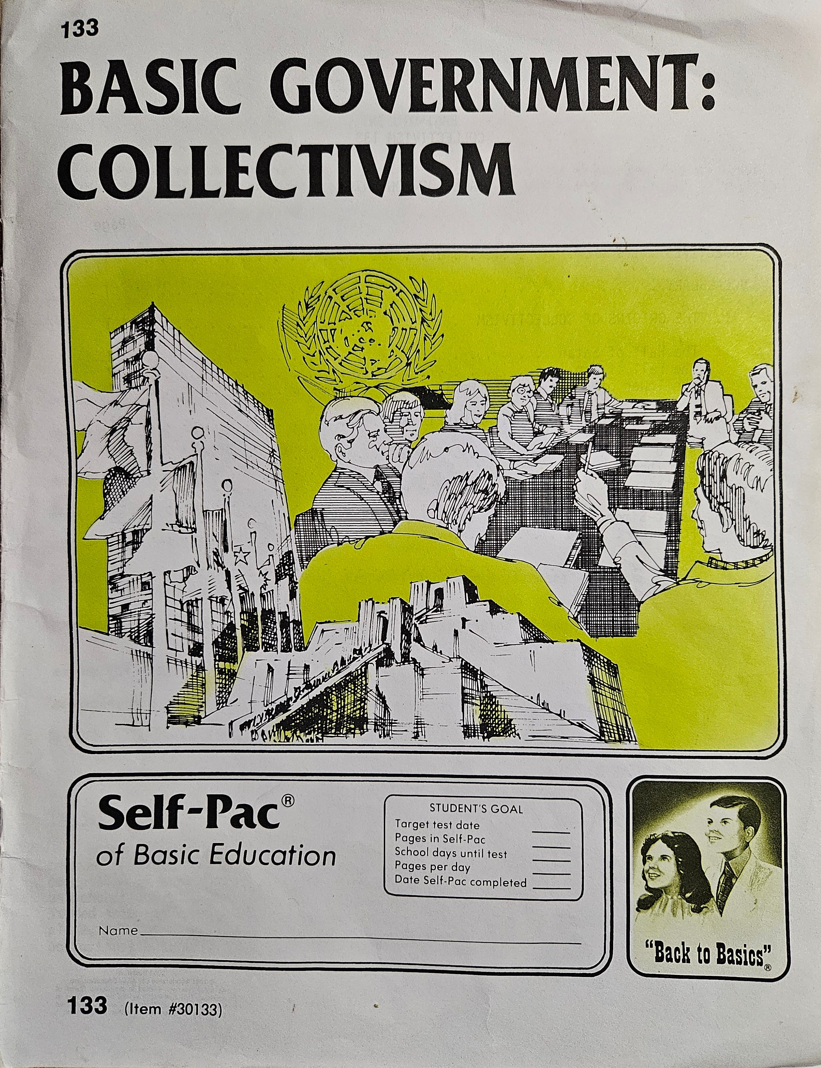 Today, I’m excited to introduce the PACEs (Packets of Accelerated Christian Education) by starting my review series on Collectivism, a senior government elective in the Accelerated Christian Education curriculum. These are the ‘textbooks’ that make up the ACE curriculum. I’m going to briefly explain how they work, give an overview of “Collectivism,” and then we’ll review the first seven pages of this PACE, which begins building the Satanic conspiracy theory that underpins this curriculum.